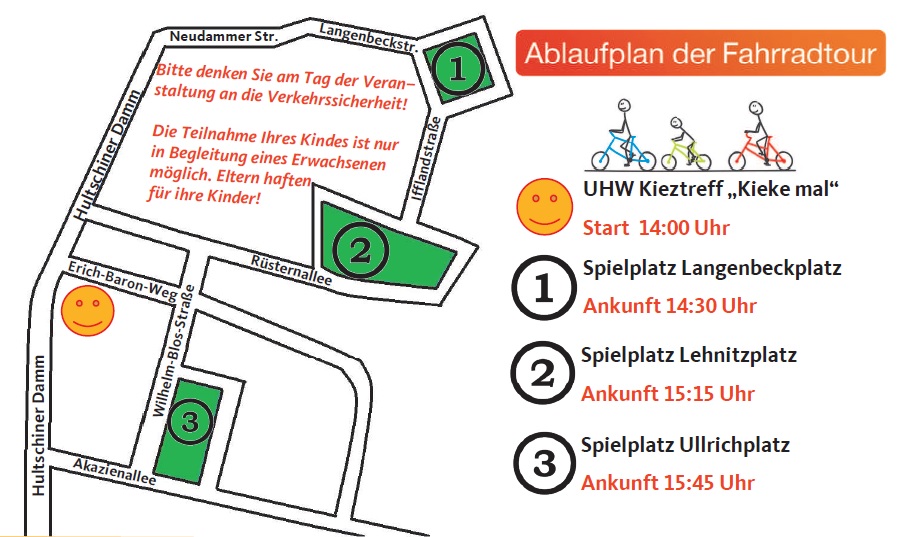 Wir werden auf der Tour drei öffentliche Spielplätze (Langenbeckplatz, Lehnitzplatz und Ullrichplatz) anfahren. Für alle Fahrradfahrer und Gäste haben wir an jeder Spielplatz-Station besondere Überraschungen vorbereitet und für das leibliche Wohl ist ebenso gesorgt.