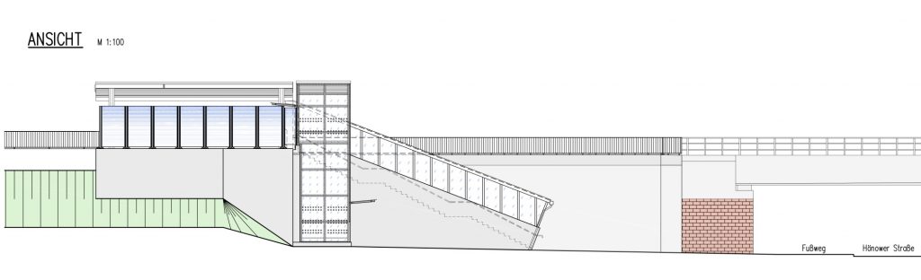 Auf der Skizze vom (Stand 22.03.2017) ist gut zu erkennen, dass eine neue befestigte, barrierefreie Zuwegung, also eine Treppenanlage mit Aufzug direkt zum Bahnsteig führen wird.