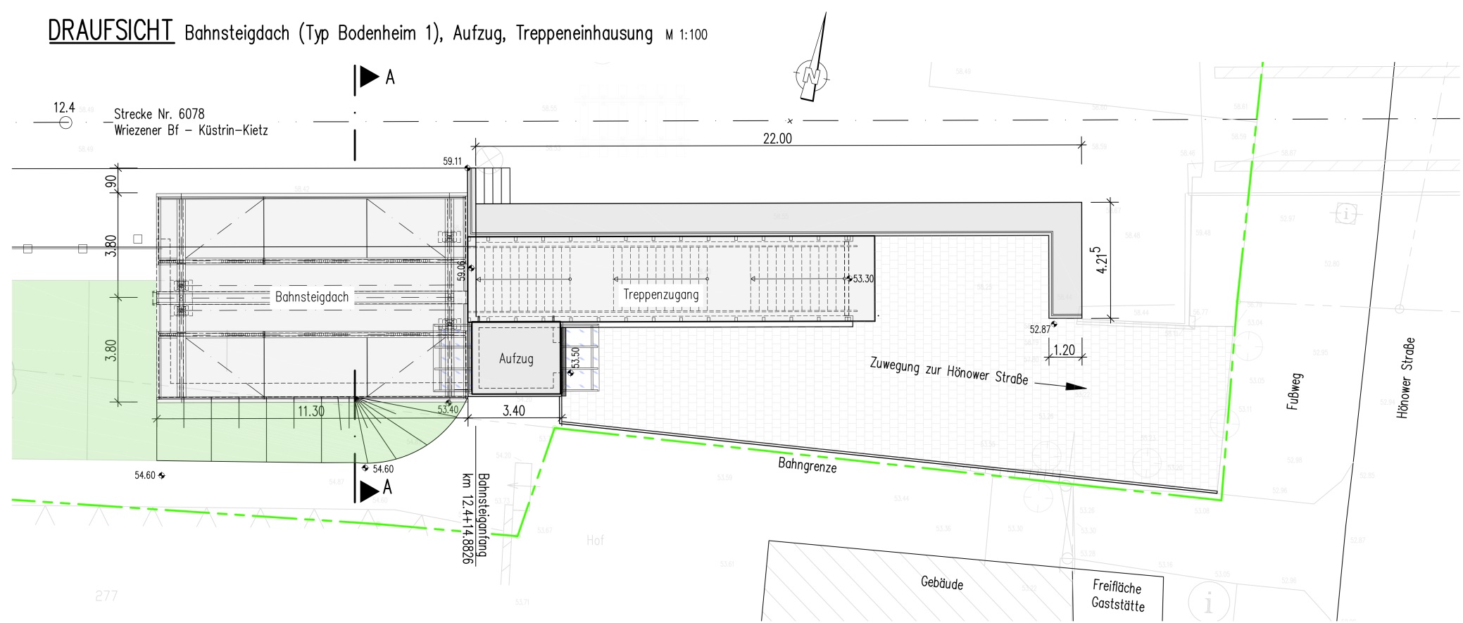 Im Bereich der Treppenanlage und des Aufzuges wird eine Überdachung installiert.