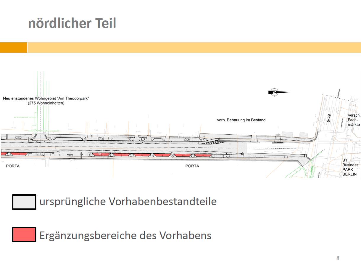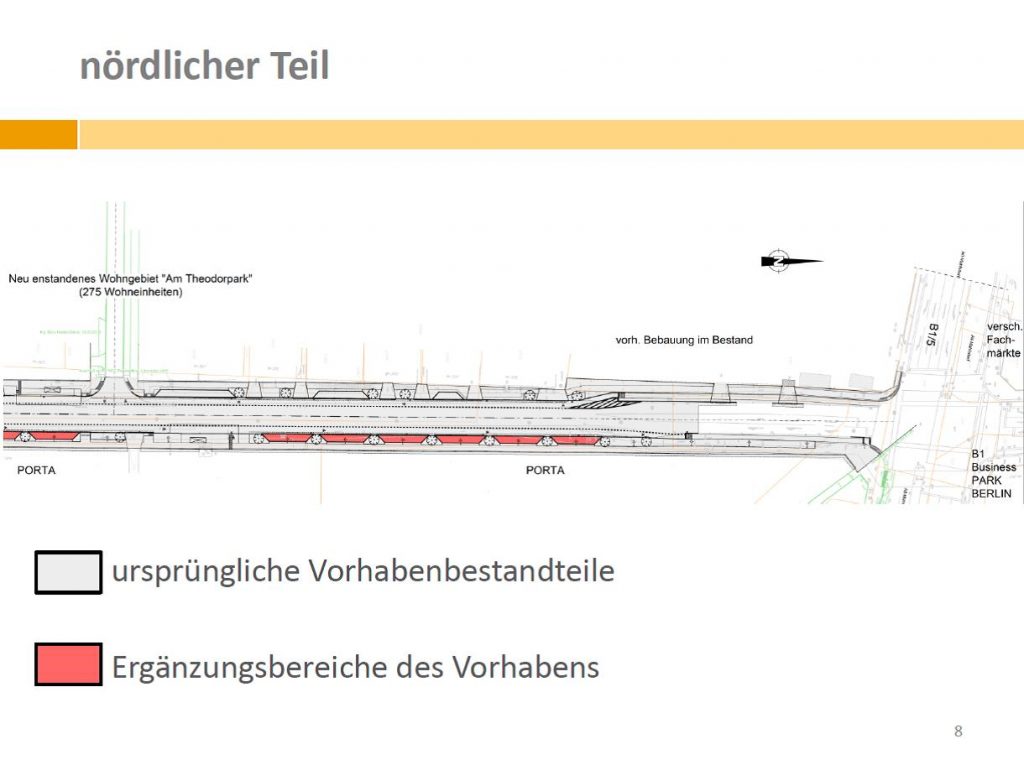 Am 22.05.2017 wurde auf der letzten gemeinsamen Informationsveranstaltung durch den beauftragten Planer und Bauherr das Baukonzept und die dazugehörigen Bauphasen vorgestellt. Dort finden sich auch eine Aufschlüsselung der einzelnen Bauleistungen von Seiten des Straßen- und Grünflächenamtes des Bezirksamtes, der Berliner Wasserbetriebe, die Ausgleichsmaßnahmen, die direkt auf die Baumaßnahme von Porta zurückgingen und die der Stromanbieter. Hier geht es noch einmal zum damaligen Blog. Dort finden Sie auch die alten Baupläne zur Sanierung der Straße.