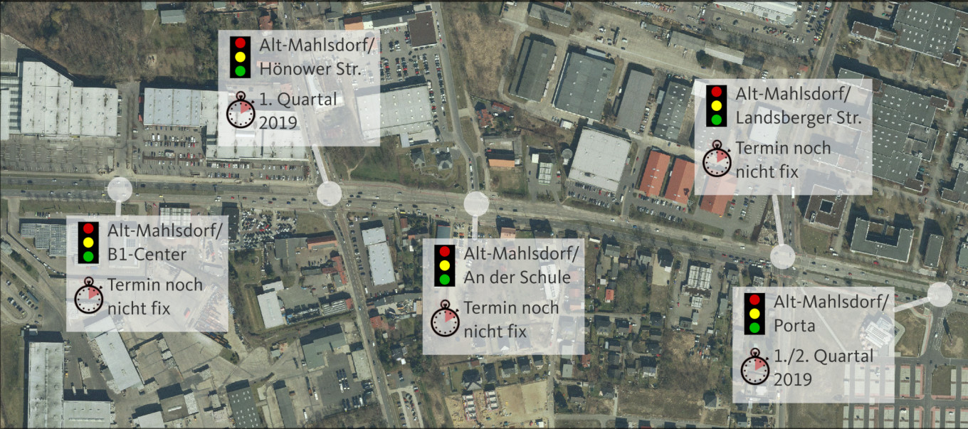 - Schaltung einer Grünen Welle von der Ampel Alt-Mahlsdorf/ B1-Center bis zur Ampel Fachmarktzentrum morgens stadteinwärts, nachmittags stadtauswärts