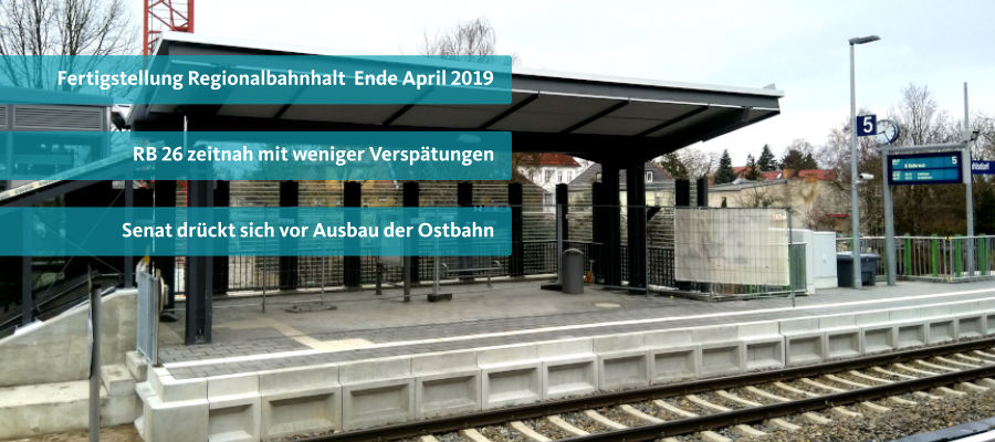 Mehrfach wurde der Fertigstellungstermin für den Regionalbahnhalt verschoben. In einer aktuellen Anfrage hat der Senat nun Ende April 2019 für den vollständigen Abschluss der Arbeiten benannt. Obwohl der Senat der Ostbahn eine hohe Bedeutung zumisst, wird unser Kiez bei den Investitionen in die ÖPNV-Infrastruktur ausgespart. Damit verpasst Rot-Rot-Grün die Chance, eine attraktive Alternative zum Auto zu schaffen.