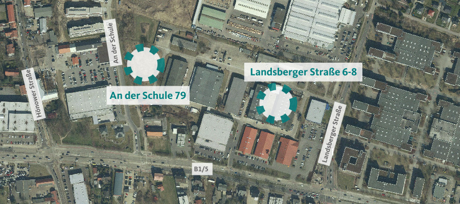 Derzeit gibt es zwei Alternativstandorte: Eine Fläche befindet sich in der Straße An der Schule 79 direkt südlich von unserer neuen Oberschule und ein Areal in der Landsberger Straße 6-8.