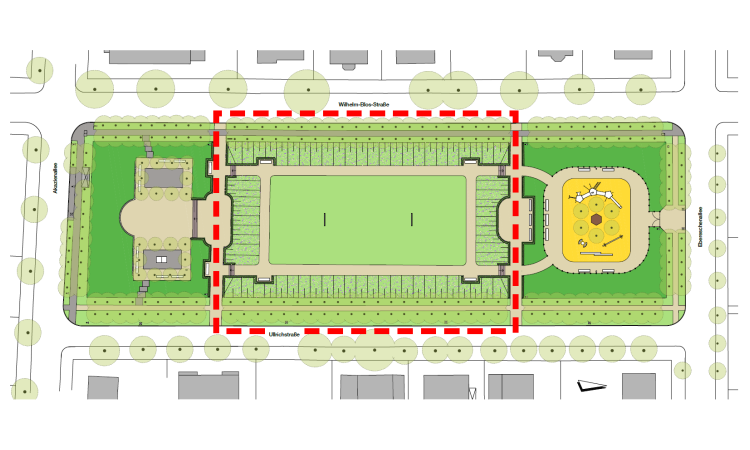 Im Rahmen der Maßnahmen werden die Hangböschungen und Rasenflächen neu modelliert. Der den gesamten Platz umfassende Baumrahmen mit den umlaufenden Gehwegen soll erneuert werden.