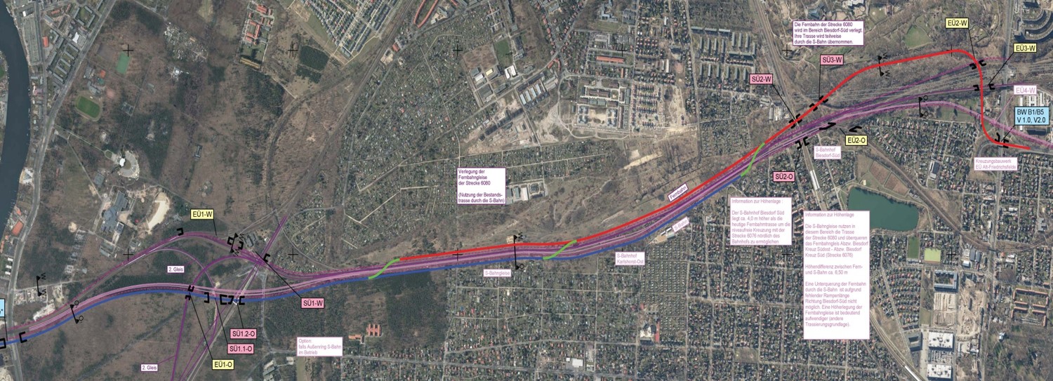 Der Senat hat endlich die Vorzugsvariante zum Bau der Tangentialen Verbindung Ost (TVO) zwischen der Märkischen Allee und der Straße An der Wuhlheide festgelegt. Diese Vorzugsvariante sieht eine Trassenführung westlich der Bahn im nördlichen Teil und östlich des Seniorenheims (Höhe Irmastraße) vor. Außerdem soll auf Anbindungen in Biesdorf- Süd verzichtet werden, da die Verkehrslast auf der TVO ausreicht, um diese ohne weitere Anbindungen bauen zu können. Die Planungszeichnung finden Sie hier im Detail.