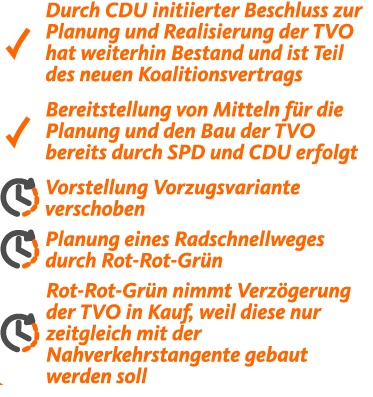 Trotz der Aufnahme der TVO in den Rot-Rot-Grünen Koalitionsvertrag kam es gleich zu Beginn der neuen Koalition zu Verzögerungen. Die von SPD und CDU begonnene Vorbereitung des Planfeststellungsverfahrens wurde gestoppt. Straße, Nahverkehrstangente und Radschnellweg sollten nur gleichzeitig geplant und gebaut werden. Doch die Planungen für die Nahverkehrstangente liegen weit hinter denjenigen der Straße zurück. Es gibt noch nicht einmal einen Planungsauftrag an die Bahn. Eine zeitliche Koppelung der Nahverkehrsstraße an die TVO würde den Bau der Straße um Jahre verzögern. Doch diese Zeit haben wir nicht: Eine Entlastung der vielen belasteten Anwohner durch tagtäglichen starken KFZ-Verkehr ist schnellstmöglich geboten. Dafür spricht auch: Die Förderperiode für die zum Bau der TVO bereitgestellten Gelder endet 2021. Wenn der Bau bis dahin nicht begonnen hat, verfallen sie und die Finanzierung der TVO wäre wieder offen.