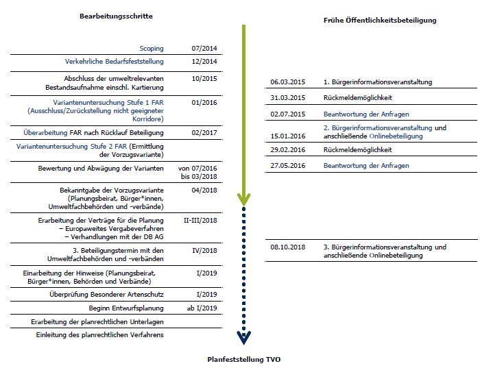 Derzeit sind die betroffenen Bezirke und Initiativen zur Stellungnahme zu den bisher identifizierten möglichen Varianten aufgerufen. Danach berät die Koalition über eine Vorzugsvariante. Die Variante sollte bis Herbst 2017 der Öffentlichkeit vorgestellt werden. Im Anschluss daran soll das Planfeststellungsverfahren beginnen.