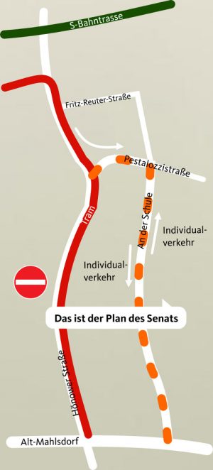 Der gesamte Verkehr von der Hönower Straße und vom Hultschiner Damm würde dann durch das Einfamilienhausgebiet der Theodorgärten vorbei am neuen Oberschulstandort und kurz vor der Friedrich-Schiller-Grundschule auf die Hönower Straße geführt werden.