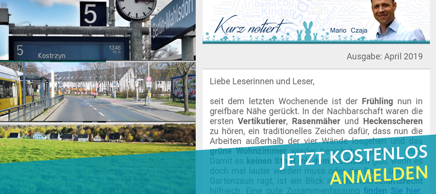 Wer den Newsletter gerne regelmäßig zum Monatsanfang per Mail erhalten möchte, kann sich gerne unter https://www.mario-czaja.de kostenlos anmelden. Die Registrierung erfolgt über die Startseite der Homepage. Die Abmeldung geht mit nur einem Klick, wenn Sie kein Interesse mehr haben. In jedem Newsletter ist am Ende ein gut sichtbarer „Abmelde-Link“.